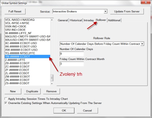 Osobně jsem si zvykl pracovat s kontinuálními daty z IQFeed a nová data od Sierra Chart chci tak mít co nejvíce přiblížena tomuto mému „standardu“. V US indexech se mi osvědčilo nastavit rolování podle data, a to konkrétně 9 dnů před třetím pátkem v expiračním měsíci. V programu je třeba to nastavit u jednotlivých symbolů pomocí Global Settings > Symbol Settings. Záložka Rollover: