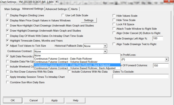 V Sierra Chart máme tak k dispozici dvě volby pro vytváření kontinuálních kontraktů – bez úprav a „back adjusted“. Volbu naleznete v menu Chart > Chart Settings, záložka Advanced Settings: