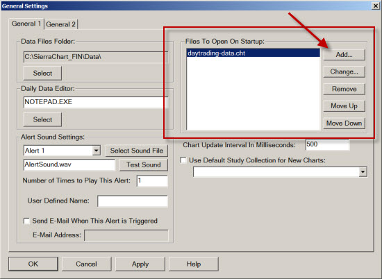 V Sierra Chart A nebudeme s grafy pracovat - jde jen o pomocnou instalaci, která se stará o načítání dat z IQFeed. Tj. grafy nemusí být jakkoliv naformátované. Stačí, když jsou zobrazené a aktualizované (tj. Sierra Chart musí být připojena k IQFeed). Jelikož stejnou konstelaci budete pravděpodobně otevírat často, doporučuji grafy uložit jako Chartbook. Chcete-li věci co nejvíce automatizovat, můžete si nastavit, aby se daný Chartbook automaticky otevřel při spuštění Sierra Chart. Konkrétně pro to slouží volba Global Settings > General Settings, kde si daný charbook vyberte mezi Files To Open On Startup: