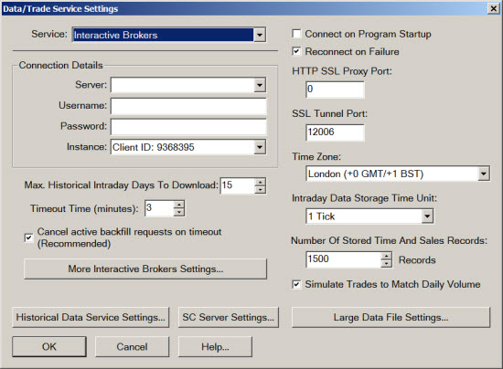 Budete-li mít v nastavení datového zdroje (Global Settings > Data/Trade Service Settings)zaškrtnutou volbu Connect on Program Startup, pak jediné co musíte pro spuštění dat z IQFeed udělat, je spustit tuto instalaci Sierra Chart.
