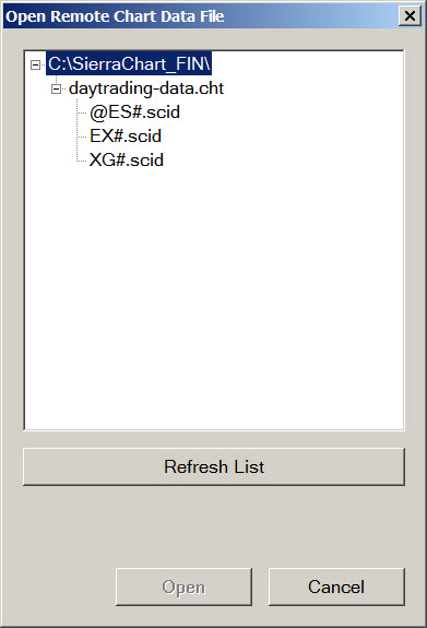 Propojte grafy mezi Sierra Chart A a B. Provádí se to přes volbu File > Open Remote Chart Data File (v instalaci Sierra Chart B - tj. v té napojené na Interactive Brokers) s tím, že volba otevře okno obsahující výběr trhů spuštěných v Sierra Chart A: