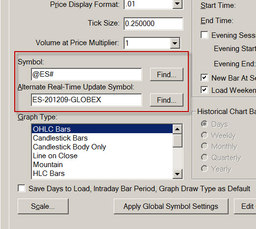 Na screenshotu je vidět, že v poli Symbol mám uvedeno @ES# což je ticker pracující s datafeedem IQFeed (toto se automaticky načte z instalace Sierra Chart A). Do pole Alternate Real-Time Update Symbol jsem však musel doplnit ES-201209-GLOBEX, což je ticker pro aktuální kontrakt ES obchodovaný přes Interactive Brokers).