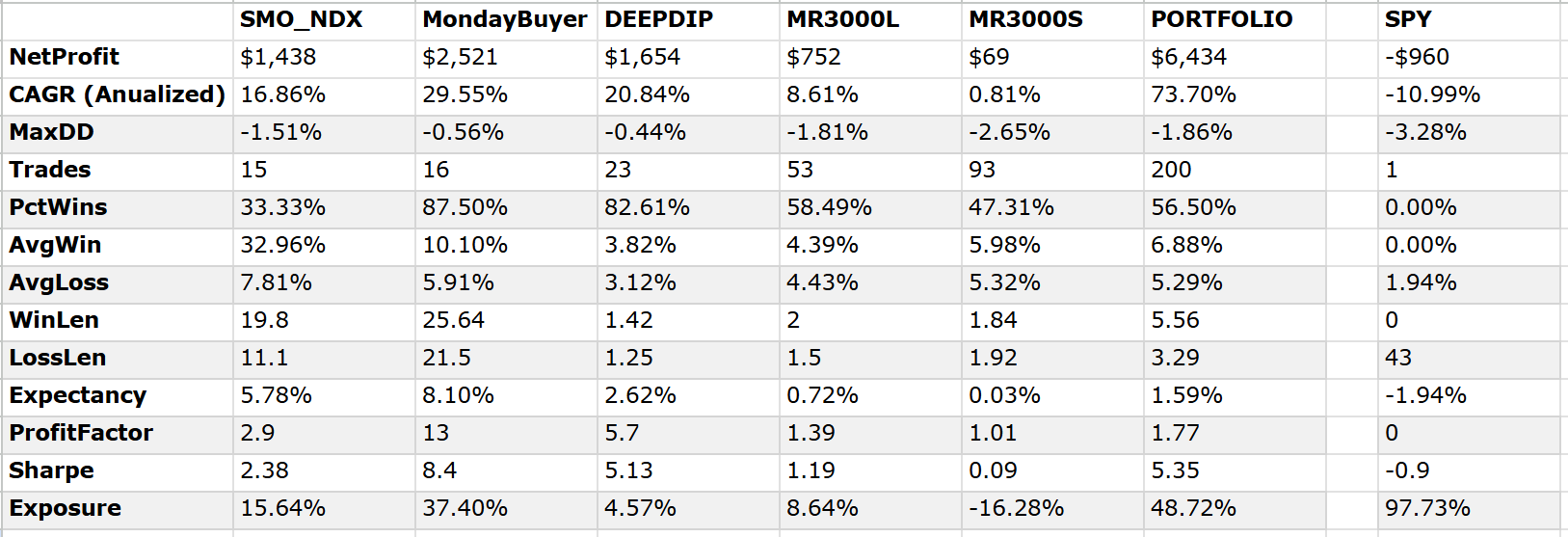 Jak konkrétně to může vypadat, vyučujeme na Finančníkovi ve Workshopu profitabilního obchodování A-Z. Od samotného spuštění zde pracujeme se stále stejným portfoliem pouhých pěti strategií – kombinujeme long mean reversion, short mean reversion a momentum, to vše na amerických akciích.