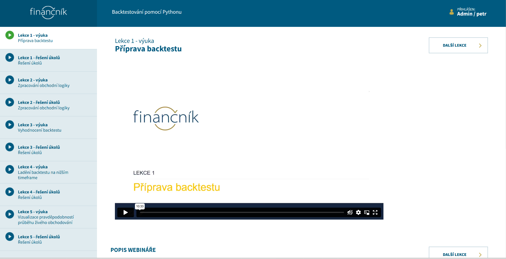 - Během 5 týdnů probereme důležité aspekty backtestování.