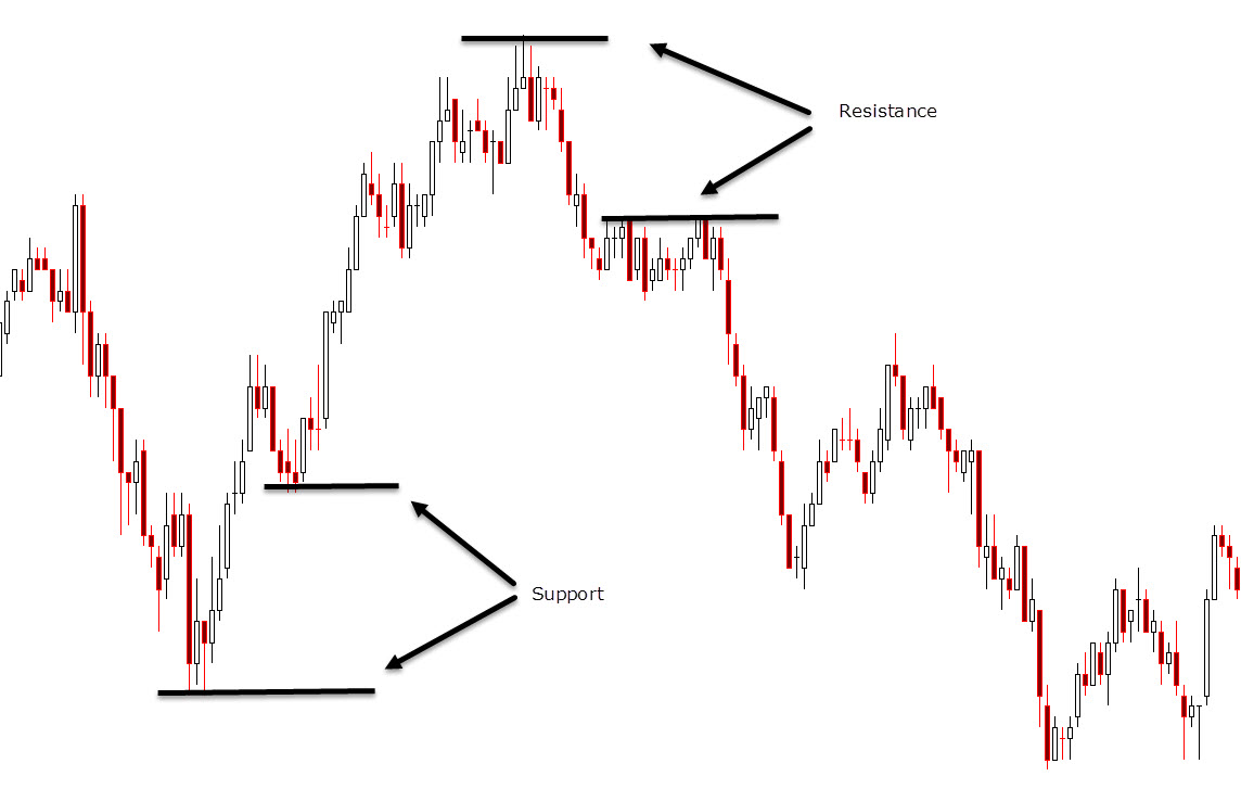 Na grafu vidíte vyznačené jen některé úrovně. Každá otočka v grafu představuje slabší nebo silnější S/R úroveň. S/R úrovně v grafu vznikají tak, že došlo ke změně nabídky a poptávky. Support si můžeme představit jako oblast, ve které aktivně vstoupili do akce nakupující a svými nákupy zastavili prodeje. V oblasti resistence byli aktivní prodávající.