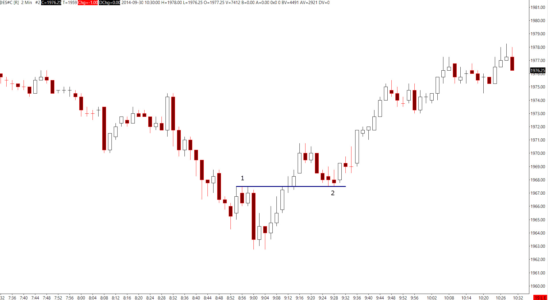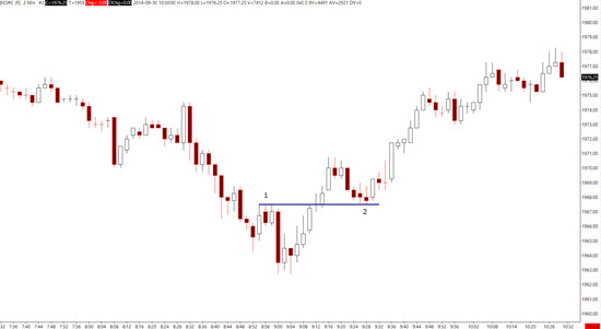 Trh měl v bodě 1 viditelný problém růst – několik dlouhých minut se zasekával o jednu a tutéž cenovou úroveň (resistenci). Později ji prorazil, aby se stejnou úrovní měli problém prodávající.