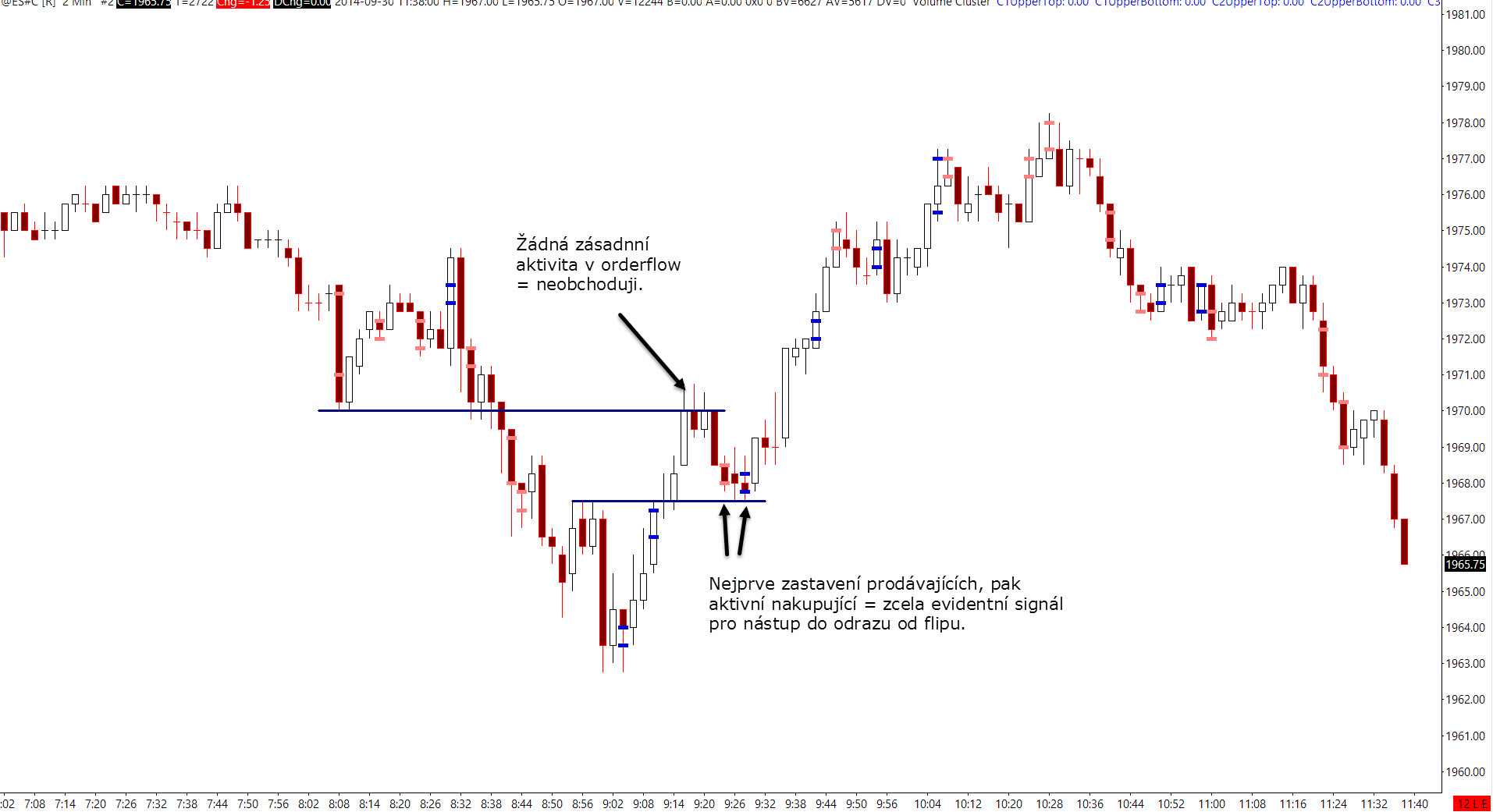 Jak dále rozvíjet přístupy založené na S/R úrovních? Cest může být určitě mnoho, můj pohled se postupem času profiloval do sledování nákupů a prodejů (orderflow) přímo na S/R úrovních. Je to velmi logické – pokud má v trhu nastat odraz od supportu, není žádné tajemství, že musí dojít k zastavení prodávajících nakupujícími.