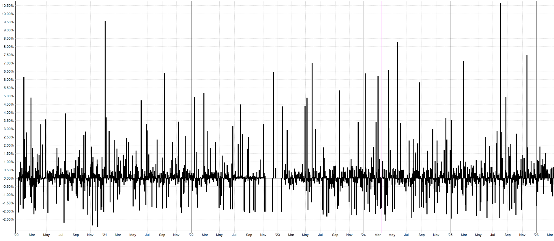 Podívejme se na distribuci denní volatility. U samotného swingového portfolia se rozložení denních pohybů drží převážně v rozpětí -3 % až +3 %: