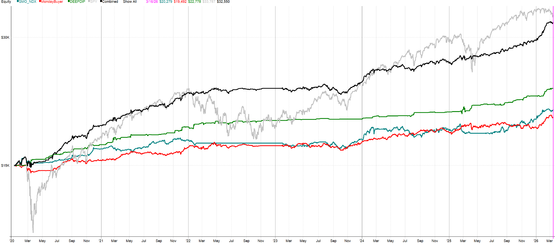 A už i s takovým využitím kapitálu můžeme dosahovat zajímavých výsledků. Pokud srovnáme jejich kombinovaný backtest s přístupem „buy and hold“ na indexu S&P 500 – a to i po započtení komisí a skluzů v plnění – výkonnost drží krok s trhem, ale podstupuje podstatně nižší riziko. Podobné portfolio produkuje zhodnocení (CAGR) ve výši 13,31 % s maximálním propadem (drawdownem) jen -5,68 % (Pozn.: Aktualizováno 31.3.2026 včetně všech níže publikovaných grafů. Původní test měl špatně nastavený position sizing pro SMO NDX).