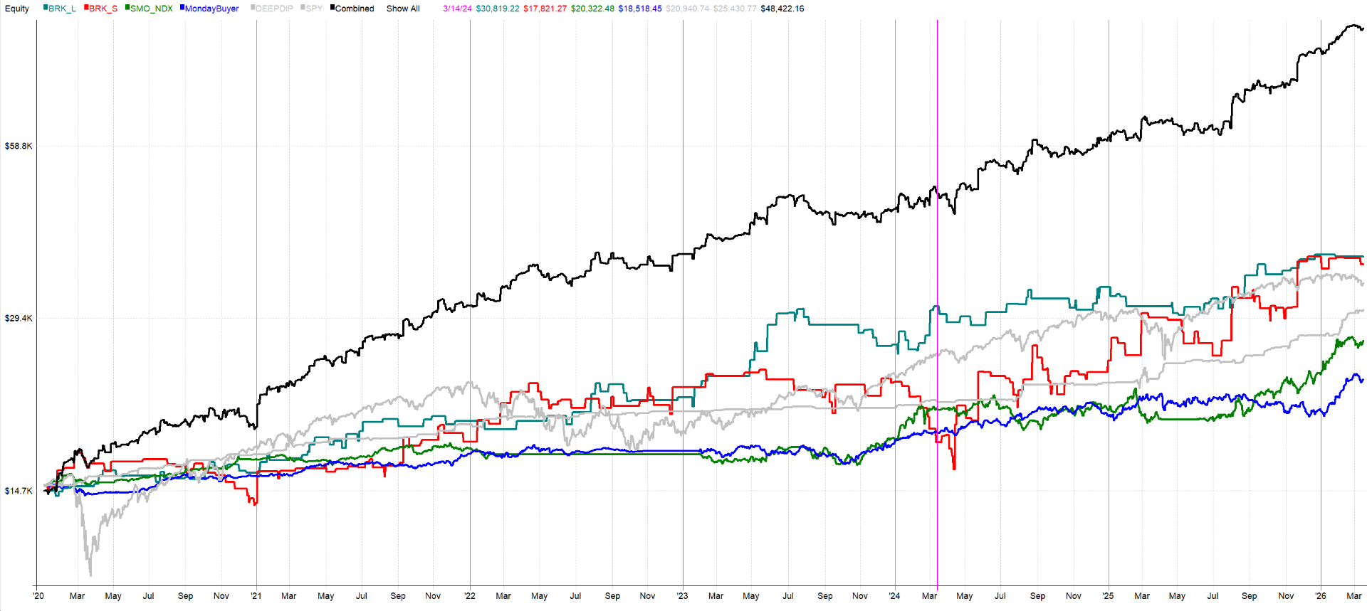 - DeepDip: Rychlá, krátkodobá mean-reversion strategie, jež pro přesné načasování vstupů využívá implikovanou volatilitu opcí. Strategii jsem podrobně popisoval v článku Časování návratu k průměru pomocí implikované volatility.