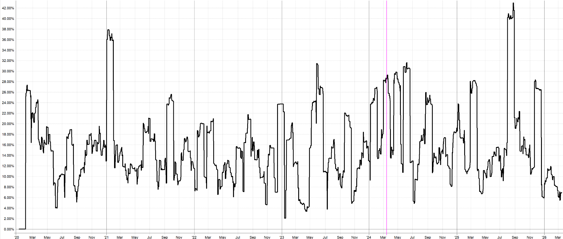 Pojďme se podívat na čísla. Vezmeme výše zmíněné tři swingové strategie a každé přidělíme 33 % portfoliového kapitálu (tedy sizing z 5 000 USD pro každou). V takovém scénáři se logicky nikdy ani nepřiblížíme k tomu, abychom naplno využili páku (tj. alokovali do strategií více než 100 % kapitálu). Naopak - průměrné využití kapitálu se bude pohybovat kolem pouhých 42 %.