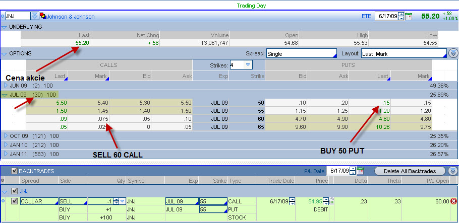 Na obrázku vidíte akcii JNJ s 30 dny do expirace. Aktuální cena akcie je 55.20, pokud bychom tedy otevírali zcela nově akcii Collar, nejprve bychom nakoupili na této ceně 100 shares (100 kusů akcií) a proti nim současně jednak nakoupili PUT opci JUL09 se strike 50 (za cenu 15 USD) plus vypsali CALL opci JUL09 na strike 60 (za kredit 7.5 USD).