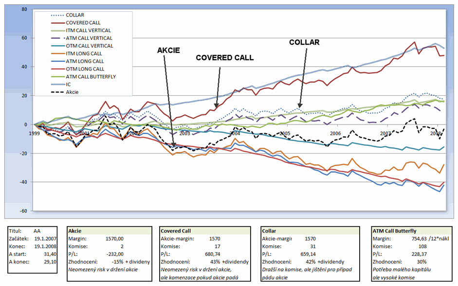 Jakou drobnou ukázku zde uvádím dva srovnávací příklady – na akciích BAX a AA. Jedná se o zcela náhodné otevření strategie Collar ve zcela náhodném okamžiku – tj. nebyla zde žádná kritéria pro to, proč otevřít zrovna AA a BAX a proč právě v okamžik, od kterého jsme backtestovali. Vše bylo skutečně ponecháno náhodě.