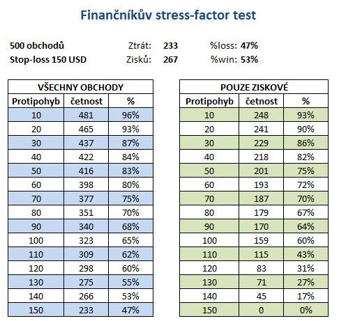 Tuto pomůcku jsem začal sám používat poměrně brzy v rámci vlastního obchodování. Osobně nejsem typ, který by s problémem popsaným výše bojoval, ale samozřejmě jako každý trader, i já zrovna nemiluji pohled na trh blížící se k mému stop-lossu, byť je to realita, na kterou je třeba se připravit a se kterou se každý musí smířit. Pomůcku jsem nazval stress-factor test a v podstatě se nejedná o nic složitého - jako vždy jde jen o zpracování trochy čísel do podoby jednoduché statistiky.