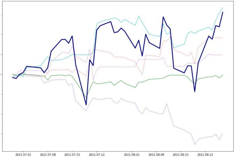 S výsledky vývoje účtu jsem zatím spokojen. Jak jsem popisoval dříve, mojí prioritou je nyní především zvládnutí všech nových principů, které jsou se správou investic spojeny. Obchoduji tak velmi konzervativně s cílovým ročním zhodnocením v rozsahu cca 15 až 30 %, kdy za letní dva měsíce portfolio vygenerovalo adekvátní část zhodnocení. A to i přesto, že se strategiím zas tak moc nedařilo. Z pěti aktivně obchodovaných strategií (kdy Finwin v tomto grafu mám zobrazen jako jednu long/short strategii) dvě vydělávaly hezky, jedna průměrně, jedna byla na nule a jedna prodělávala.