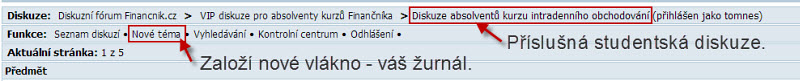 Založit žurnál je pak velmi snadné - otevřete si příslušnou VIP diskuzi, k níž jako student máte přístup a v níž si chcete založit žurnál, klikněte na "Nové téma" a to pojmenujte jako svůj žurnál / deník .