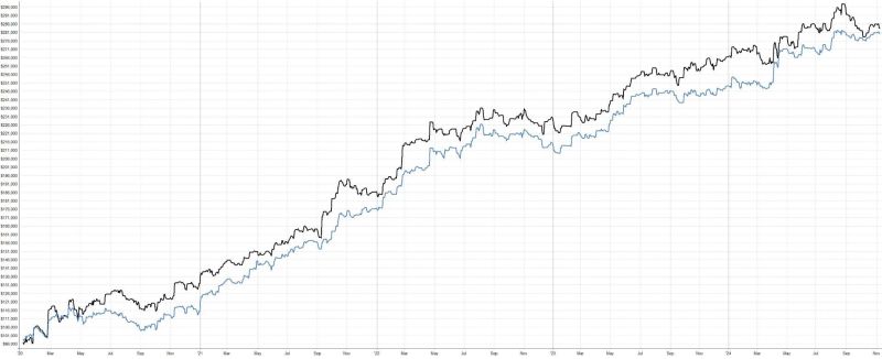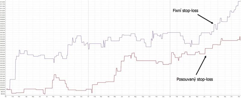 Černá linka představuje výkonnost systému s fixním stop-lossem, modrá linka s posouvaným (trailovaným stop-lossem). Výkonnost má započítané komise (a kapitál není reinvestován). A jak je vidět, oba grafy se tolik neliší. Výkonnost je velmi podobná – strategie dosahuje průměrného ročního zhodnocení cca 37 %.