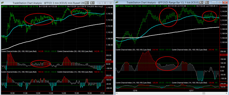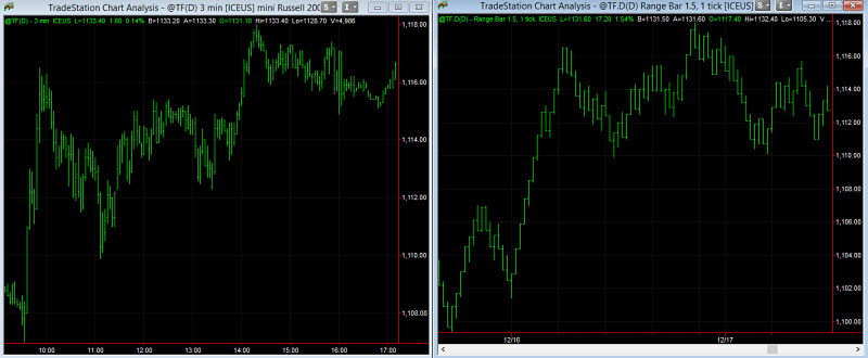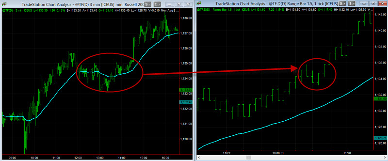 Koukněte například na graf níže. Na levé straně grafu vidíte 3minutový graf, na pravé straně alternativní graf Range bars s velikostí každé úsečky 150 USD. Rozdíl mezi oběma typy grafů začíná být nejzřetelnější právě v okamžiku, kdy minutový graf běžně generuje šum (trh má nejistý směr a je spíše chopového charakteru). V takové momenty nejenom, že alternativní graf může vypadat mnohem přehledněji, ale především indikátory vykazují čistší průběh.
