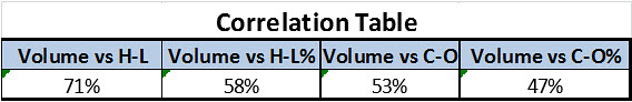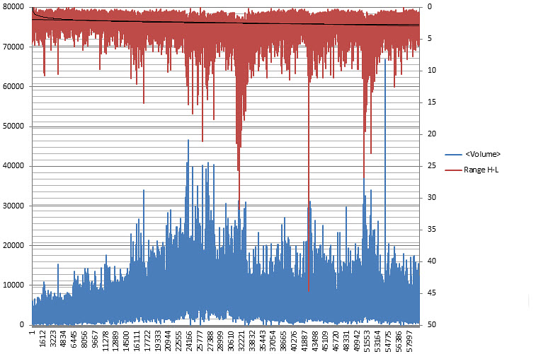 Mezi volume a volatilitou vyjádřenou rozdílem high a low každé úsečky (volume vs. H-L) existuje korelace celých 71 % (opět na trhu e-mini Russell 2000). Pokud bychom vyjadřovali volatilitu jinými způsoby (jako procentuální rozdíl nebo jako rozdíl mezi close a open), korelace už nám sice klesne, ale jako skutečný ukazatel volatility považuji právě rozdíl mezi high a low a zde je korelace velmi vysoká a o závislosti mezi volume a volatilitou tedy ani z tohoto pohledu nemůže být pochyb.
