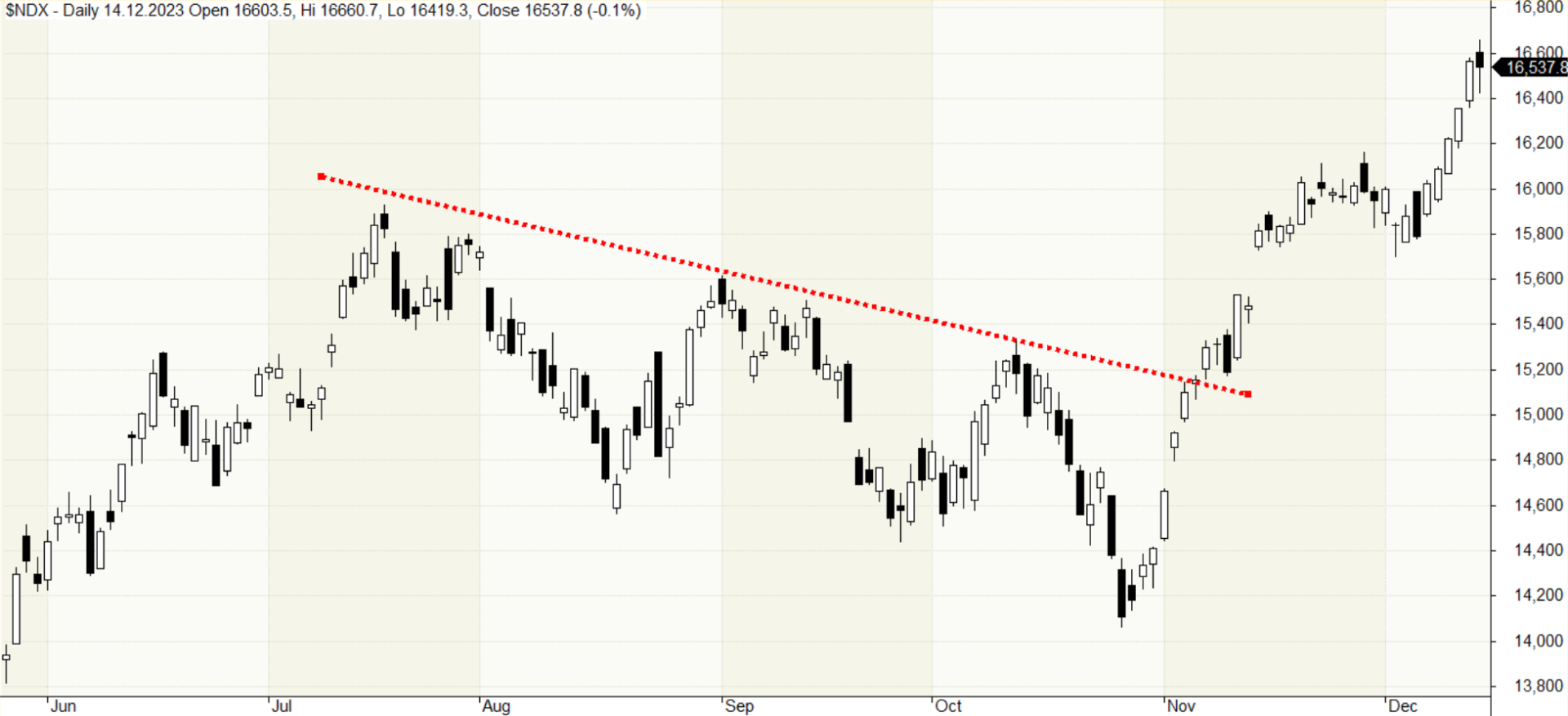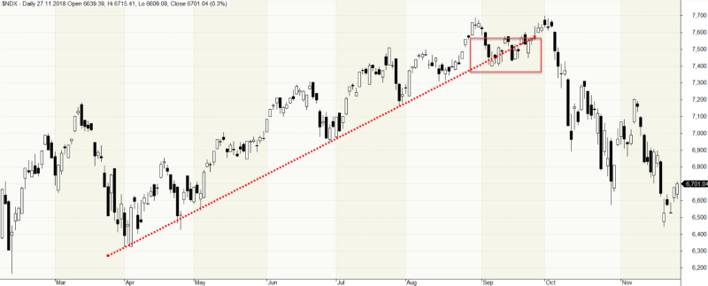 Trendová čára identifikující uptrend v trhu Nasdaq. Čára je vedena spojením výrazných swingových den v trhu. V oblasti červeného obdélníku je patrné, že trh přestává linku respektovat a hrozí obrat vývoje směru trhu.