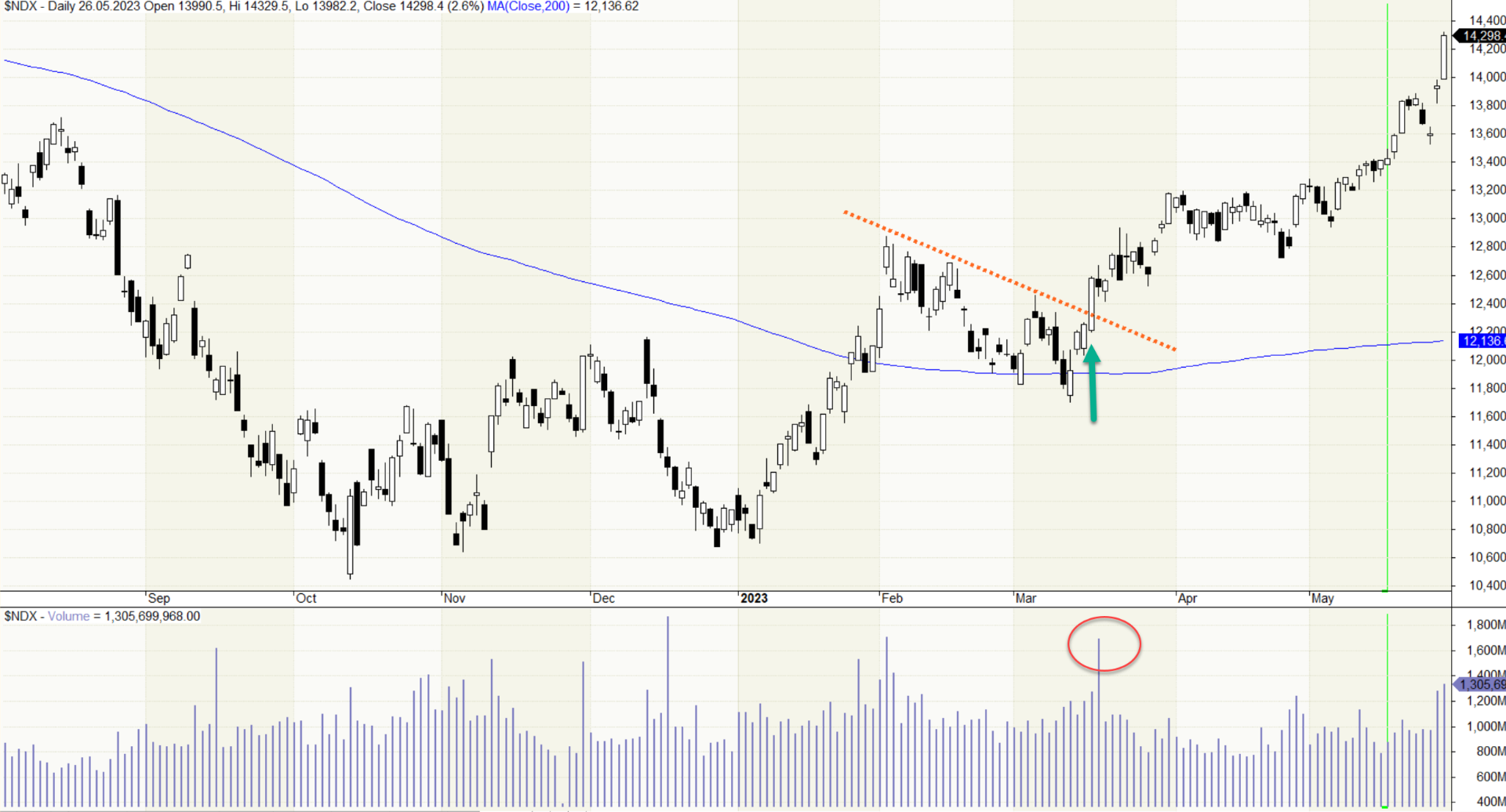 - Nákupní signál můžeme identifikovat průrazem klesající trendové linky při vysokém volume (objemu obchodů). To svědčí o vysokém zapojení obchodníků.