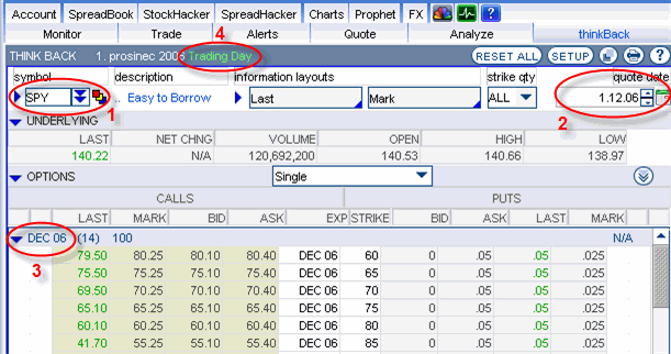 Přepneme se do záložky thinkBack kde se pracuje podobně, jako s živými daty v záložce Trade. Do políčka symbol (bod 1) je třeba vložit symbol podkladového aktiva a pak již stačí vybrat v poli quote date (bod 2) příslušné datum, ke kterému se chceme v historii odkázat. V okně Options pak máme k dispozici dané historické expirační měsíce (bod 3) s konkrétními striky a historickými daty. Zobrazená data jsou EOD, tedy ke konci obchodního dne, což je myslím pro tyto účely naprosto dostačují i s ohledem na poměr cena/výkon. Ceny opcí se pochopitelně v průběhu dne mění tak, jak se každou chvíli mění cena podkladového aktiva, ale při základním testování strategií se stejně většinou potřebujeme "odrazit" od určité hodnoty (a kdo potřebuje přesnější data, může investovat např. do OptionVue). Co je důležité, jde o, podle lidí z TOS, skutečně obchodované ceny, nikoliv teoretické výpočty. A co je podstatné - u historických cen lze nastavit zobrazování všech položek jako u realtime údajů - tj. především řecká písmena, podle kterých řada traderů své opční obchody řídí.