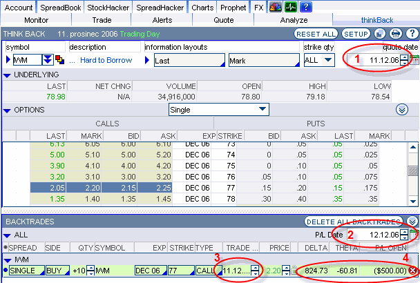 V modulu thinkBack lze testovat i konkrétní obchody. Běžným způsobem můžeme otevřít pozici (jednoduchou opci nebo kompletní spread) a sledovat její vývoj v podokně BackTrades. Zde je možná ovládání trochu méně intuitivní, neboť nabízí několik možností pro nastavení data.