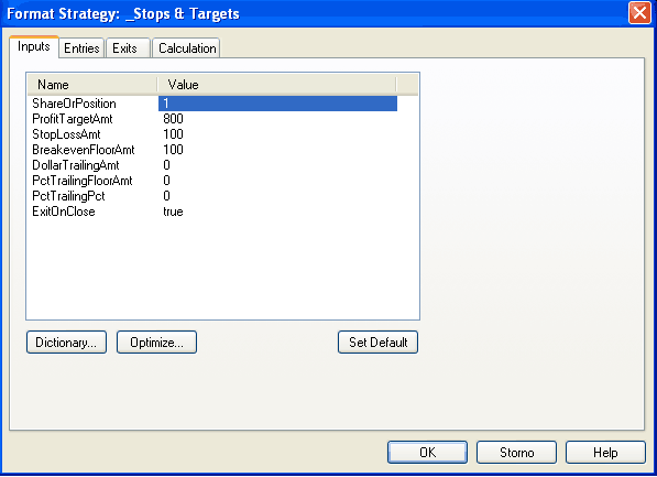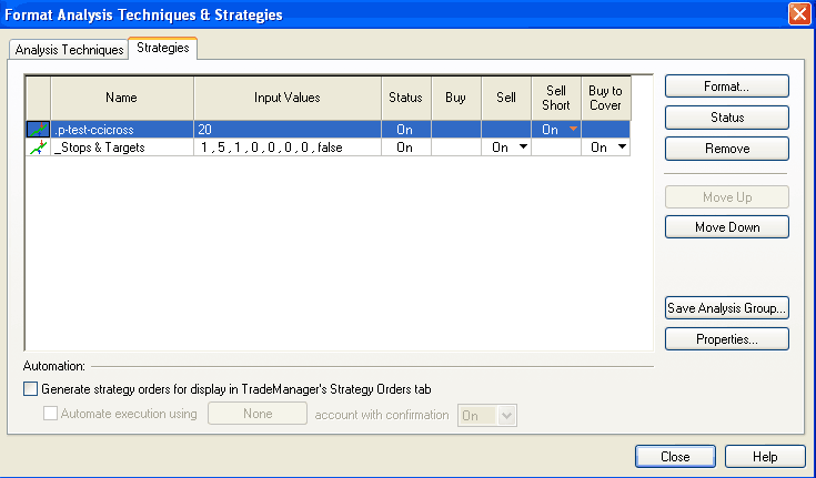 Strategii je tak třeba buď rozšířit o další kód pro uzavření otevřených pozic, nebo použít další strategii, která bude pozice uzavírat. Taková strategie je v TradeStation připravená a pro testování jednodušších systémů je velmi snadno použitelná - jmenuje se "_Stop & Targets". Strategii vložíme do grafu stejným způsobem, jako již bylo popsáno výše - tedy přes Insert > Strategy. Okno "Format Analysis Techniques & Strategies" pak bude vypada následovně: