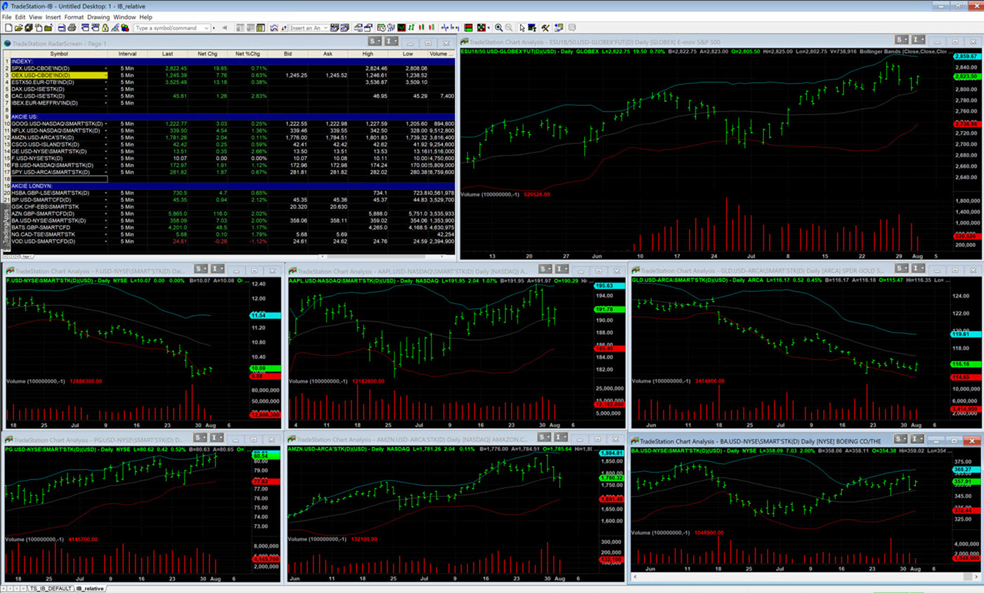 Ukázka prostředí TradeStation s aplikovanými indikátory. Software je napojen na Interactive Brokers:
