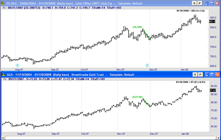 Jiný příklad - vývoj komoditního kontraktu zlata vs. ETF GLD, které vývoj zlata sleduje: