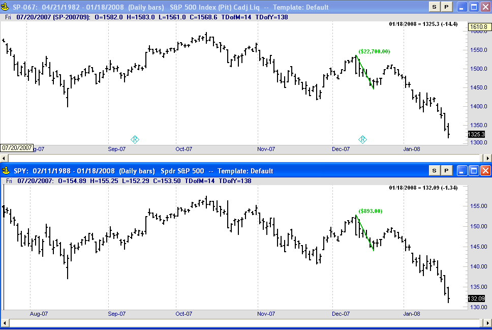 Další využití může být např. u "mechanických" strategií určených pro indexy. Osobně máme rádi strategie a patterny Larryho Willamse, který však pracuje s hodně velkými stop-lossy, např. 3000 dolarů v trhu S&P. Nicméně i takové strategie se dají živě testovat a obchodovat s příslušným ETFs. Např. SPY velmi blízko kopíruje S&P 500: