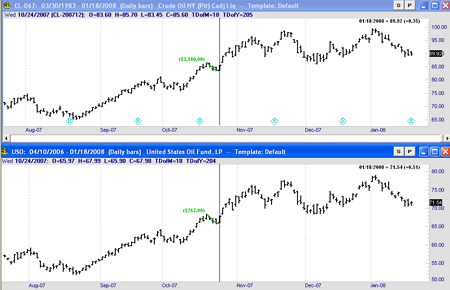 Malý obchodník, který plánuje trendově daný trh obchodovat, může použít např. ETFs USO. Ten přesně nekopíruje absolutní cenovou hladinu new-yorské ropy, ale jak vidíte na screenshotu, koreluje opravdu velmi úzce. Akcie ETFs se kupuje/prodává stejně jako akcie klasických firem. Tj. obchodník v případě naší uptrend spekulace může zakoupit přesně tolik akcií, abych jejich cena reflektovala jeho příslušný money-management. Při 100 akcií ETFs USO pak bude korekce přibližně 260 dolarů, tj. takový obchod lze realizovat i s velmi malým účtem do 10 000 dolarů.