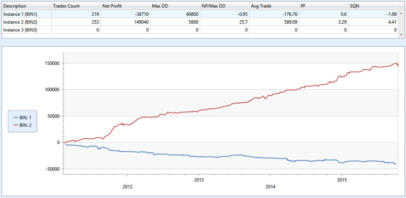 Modrá equity representuje obchody, které algoritmus vyhodnotil ještě před jejich vstupem jako potenciálně nezajímavé, a tudíž vstup vůbec neprovedl. Červená equity jsou zbylé obchody. Jak vidno, algoritmus v reálném čase (zde simulovaném skrze forward testing) dokázal vyhodnotit jako nezajímavých 219 obchodů, tyto obchody zcela přeskočit, a ušetřit nám tak 38 710 USD na kontrakt. Nemluvě o equity, která je nyní naprosto ideální a o moc lepší už být nemůže.
