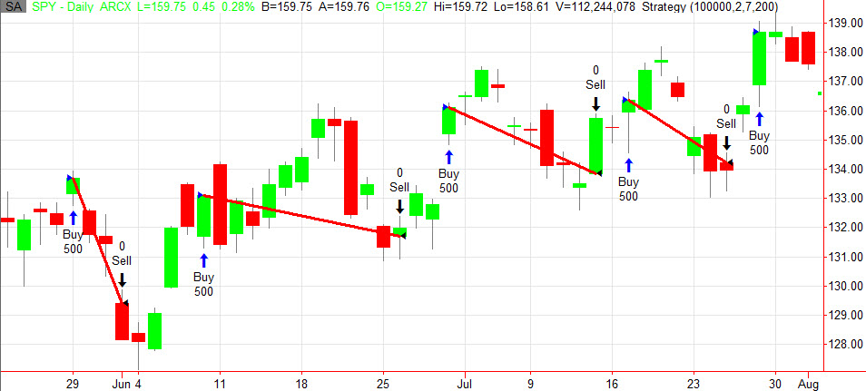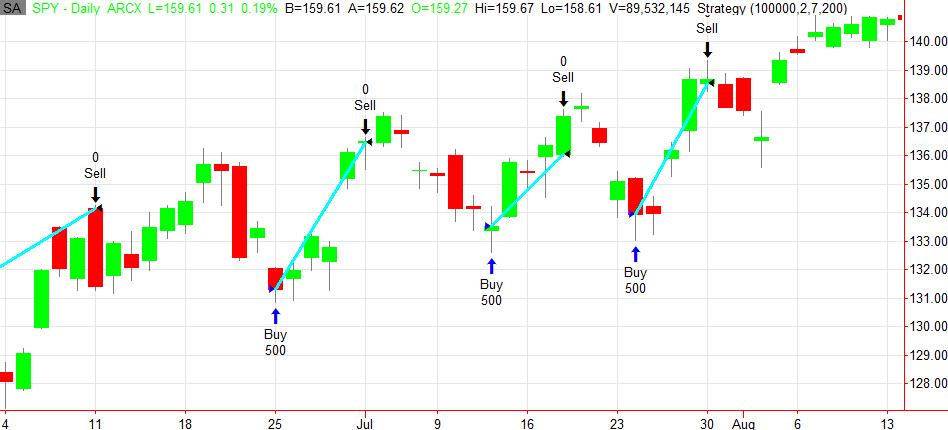 Systém, který autor nazývá Double 7’s je extrémně jednoduchý. Nejprve musí být splněna podmínka, aby byl trh v uptrendu. Za uptrend je považována situace, kdy se trh obchoduje nad svým 200denním klouzavým průměrem. Následně se generuje nákupní signál v okamžiku, kdy trh uzavírá nejníže za posledních sedm dnů (close úsečky je níže než posledních sedm close). Pozice je ukončena v momentě, kdy trh uzavírá nejvýše za posledních sedm dnů.