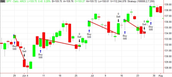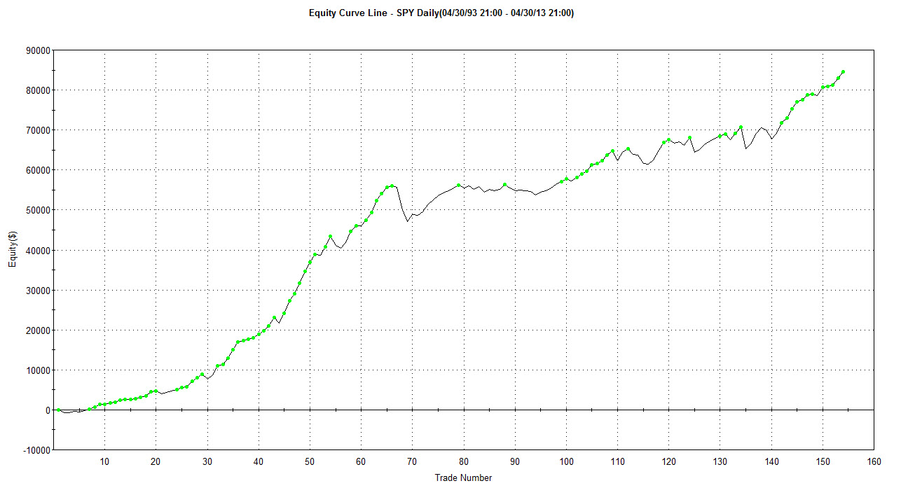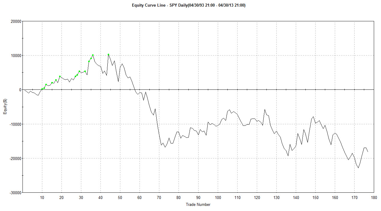 Výsledky jsou zobrazeny na denních datech trhu SPY za posledních 20 let. Tedy úctyhodný vzorek dat. SPY je ETFs (viz Trhy podrobněji: ETFs) silně korelující s indexem S&P 500 a výsledky reflektují nákup fixních 500 shares/obchod. Jelikož jde skutečně jen o demonstraci popisovaného principu, tak ve výsledcích nejsou zahrnuty komise a skluzy, které však uvedenou equity příliš neovlivní. Přestože systém vstupuje "proti logice" (nakupuje ve výrazném poklesu), jeho úspěšnost je 76 % při RRR cca 1:1.