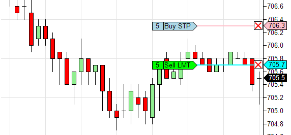 Osobně v tomto případě postupuji na „nejistém“ internetu následovně. Zadám v programu NinjaTrader samotný vstupní limitní příkaz a současně hned zadávám do trhu ochranný stop příkaz. V případě vstupu do krátké pozice by situace vypadala následovně: