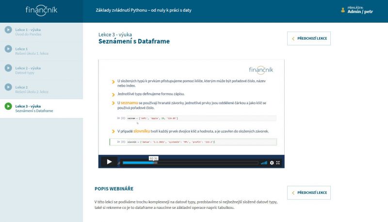 3. Start do smysluplného obchodování je z počátku o překonání mnoha nových principů, zejména z oblasti zvládnutí techniky. Většina začátečníků toto nechce slyšet a pouští se do směrů, které vypadají snadně – vesměs takových, kde jim někdo poskytne určité indikátory, které jen vizuálně sledují a podle nich „klikají“. Mějte ale na paměti, že drtivá většina takových obchodníků v trzích o své peníze přijde. Schopnost, kterou budete potřebovat získat, je alespoň základní znalost analýzy dat. Protože o analýze dat a hledání dlouhodobých pravděpodobností celé obchodování je. Čím dříve začnete na schopnosti analýzy dat pracovat, tím dříve se dostanete k cíli. Můžete použít Excel, na Finančníkovi nejvíce pracujeme s bezplatným skriptovacím jazykem Python. Ten pro účely datové analýzy není složitý (protože pracujeme jen se zlomkem možností Pythonu), ale je to samozřejmě něco, do čeho musí neprogramátor (kterých je nás zde většina) proniknout. Mimochodem v rámci TechLabu nyní běží několikatýdenní mentorovaný bezplatný minikurz základů zvládnutí Pythonu, který vás touto problematikou provede a maximálně doporučuji využít příležitost se do něj zapojit (registrací do TechLabu). Nyní jsme ve výuce přibližně v 1/3:
