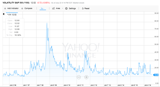 Podíváme-li se na současný graf VIXu (například na Yahoo finance, kde je běžně dostupný všem), tak vidíme, že je nyní celková volatilita v indexech velmi nízká: