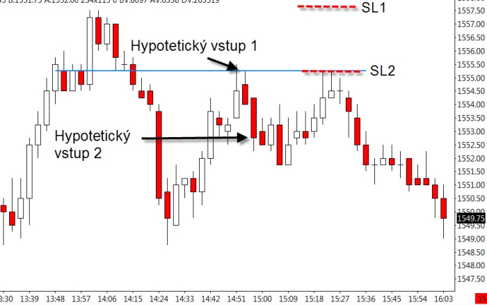 Obchodník vstupující v bodě 2 má k dispozici více informací. Už ví, že v jeho vyznačené oblasti (v našem hypotetickém případě modrá linka) se trh skutečně otočil. Ovšem za tuto informaci platí výrazně horší vstupní cenou, neboť trh od high swingu již urazil cca 2,5 bodu. Vstoupí-li obchodník do short obchodu na close úsečky, bude muset buď pracovat s větším stop-lossem než 2,5 bodu nebo použije „standardní stop-loss“, který mu vystačí jen tak tak k SR úrovni, kde jej trh „jako na potvoru“ z obchodu vyhodí.