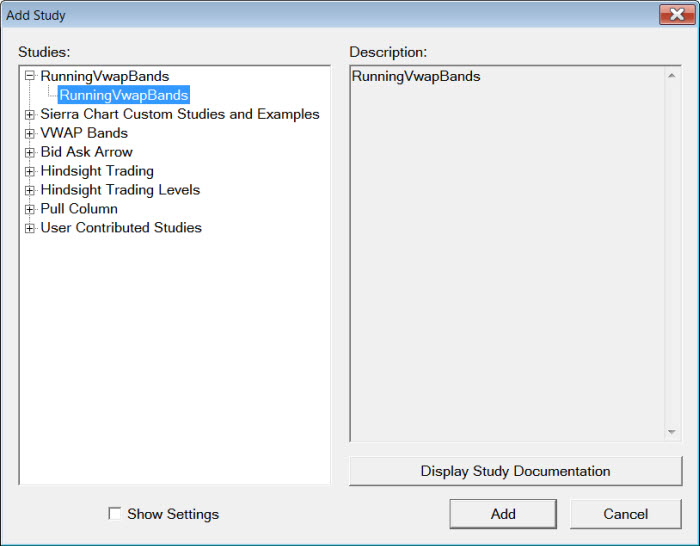VWAP pásma jsou v Sierra Chart k dispozici také, jen trochu skrytě. Zvolte Analysis > Studies a netradičně klikněte na tlačítko Add Custom Study... ve spodní části dialogového okna. V okně Add Study následně vyberte Running VwapBands, které vám zobrazí pásma stejně, jako to mám na výše uvedeném screenshotu. Pásma lze upravovat již přes běžné preference indikátoru.