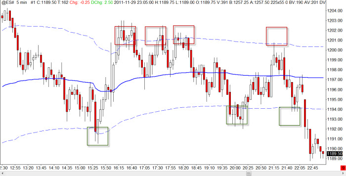 Ukázka aplikace VWAP bands v trhu, který se pohybuje do strany (VWAP je plochý). Vyhledávání obchodních příležitostí na hraně pásma dané první standardní odchylkou od VWAP nám v takovém případně může poskytnout dobrý základ pro budování obchodního přístupu.