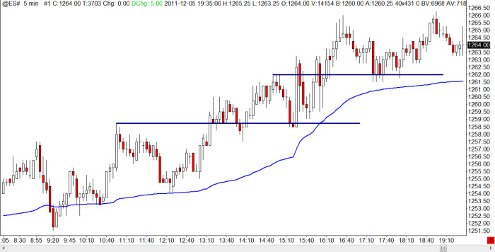 Silně rostoucí VWAP potvrzuje hlavní tendenci trhu. V takové situaci lze obchodovat např. do směru trendu na flipech – místech, kde se původní resistence mění v support (viz články Základní nástroj pro vylepšení profitability tradera? Zvládnutí supportů a resistencí a Zvládnutí supportů a resistencí - konkrétní ukázky a komentáře).