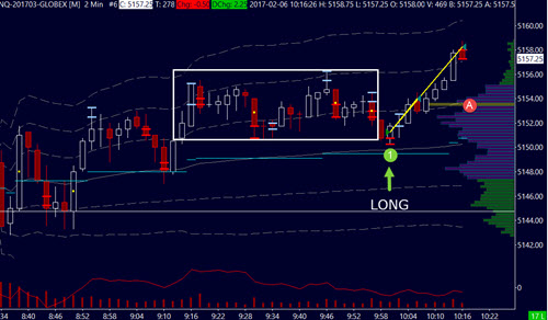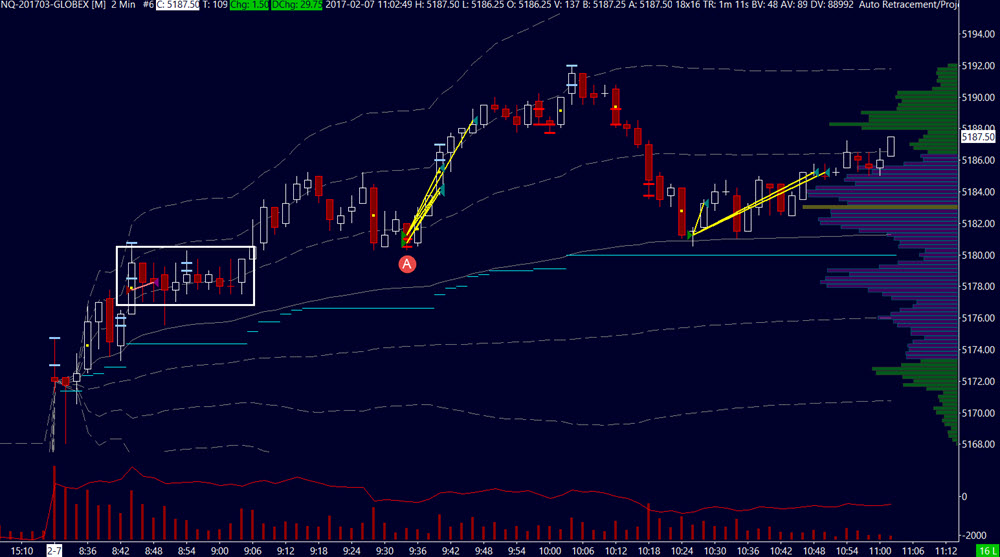 Bod „A“ je typický intradenní FIMS obchod (konkrétně z trhu NQ z úterý 7.2.2016):