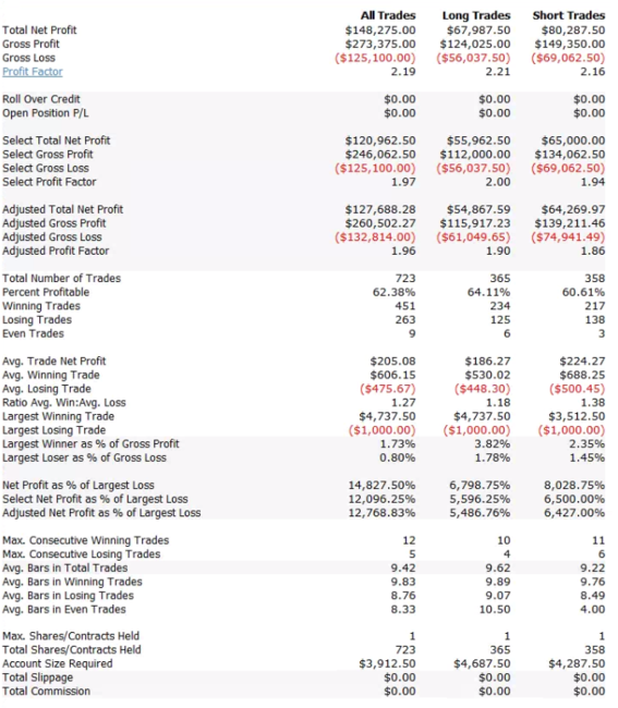 Jde o report historické výkonnosti testované intradenní strategie a na první pohled máme k dispozici spoustu informací (a to ještě na screenshotu nejsou zobrazeny všechny). Není divu, že začínající obchodníky mohou podobné statistiky vystrašit a raději se jimi příliš nezabývají.