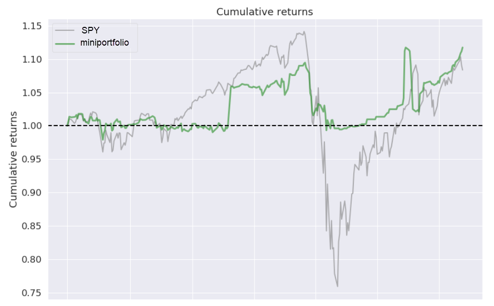 Miniportfolio obou strategií obchodovalo s anualizovaným výnosem 28,7 %, sharpe ratiem 1,63 a drawdownem -2,8 %. Vidíte, že i třetinová účast strategie Monday Buyer například i v tomto krátkém období výrazně snížila drawdown. Na druhou stranu ale spojení obou strategií nepřekonalo benchmark v podobě indexu S&P 500.
