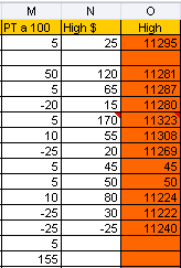Tímto způsobem získáme jakýsi rozumný průměr výstupů mezi PT a protnutí hranice 100 (sloupec M na obr. 2).