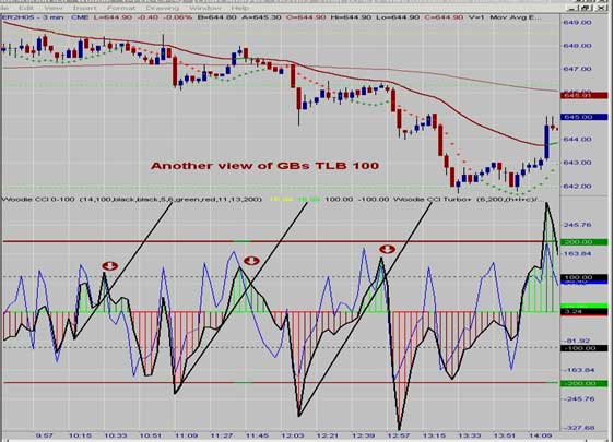 Na obrázku vidíme trh ER2, a to v podání 3minutového grafu. Tmavě červená čára v grafu trhu je EMA34. vidíme, že hlavní trend je směrem dolů. Čekáme tedy na moment, kdy CCI vyšplhá nad hranici +100, poté tuto hranici protne zpět do „běžné“ oblasti a zároveň prolomí trendovou čáru. Na grafu vidíme přímo 3 vstupní úrovně, během kterých bylo těchto podmínek dosaženo. Všechny tyto 3 vstupy jsou platné patterny GB100. Důležité je i splnění posledního pravidla – ani v jednom z případů nebylo na CCI vytvořeno 6 úseček nad nulovou linkou ještě dříve, než byl vytvořen platný vstupní signál – všechny vstupní signály jsou tedy plně platné.