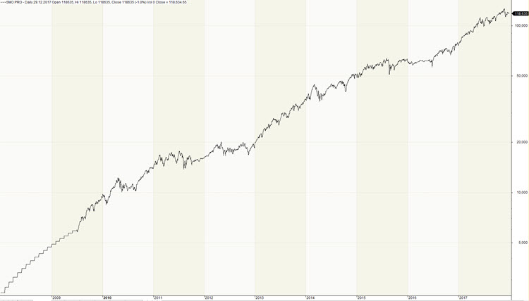 Na uvedené křivce je vidět, jak se vyvíjel stav účtu v čase (zobrazeno v logaritmickém měřítku). „Schůdky“ na začátku grafu jsou z důvodu, že strategie stála mimo trhy (viz filtr popisovaný v citovaném článku). Účet se tak zvyšoval jen o naše měsíční vklady.