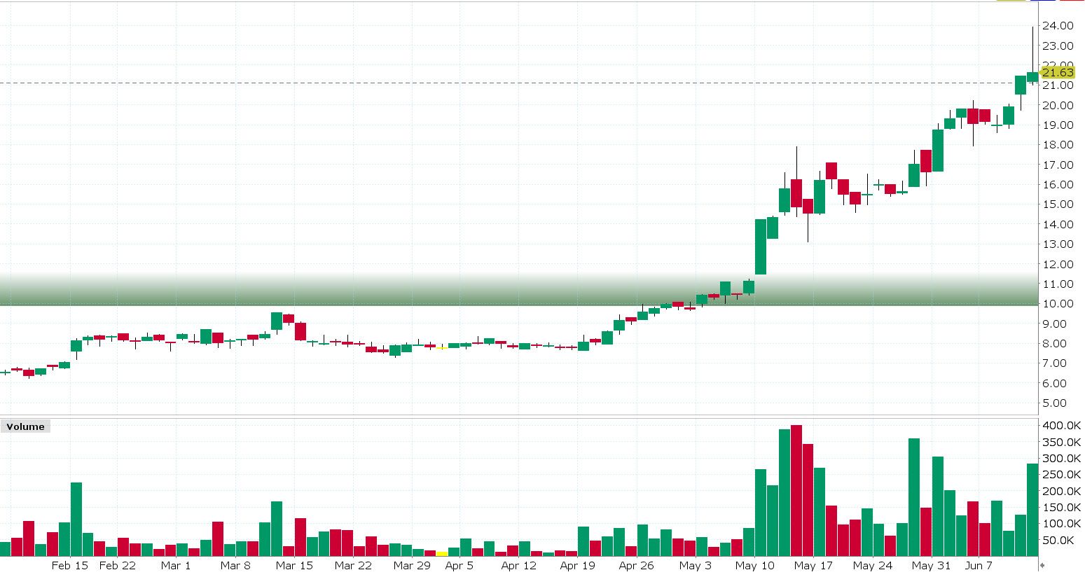 U strategie je potřeba se připravit na trochu nižší úspěšnost obchodů (historické testy indikují cca 42 %), ale o to příznivější poměr zisku k risku. V historickém backtestu vydělá ziskový obchod průměrně 2,5x tolik, kolik je průměrná ztráta. V praxi to znamená, že řada otevřených obchodů se nerozjede a zavřu je v menší ztrátě. Občas ale systém chytne parádní trend. Jako třeba v akcii SBOW, ve které má systém nyní otevřenou pozici. Trh jsem na základě signálu nakoupil začátkem května za cenu cca 10, aby se nyní, přibližně po měsíci, trh obchodoval za dvojnásobek: