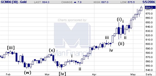 Z dlouhodobějšího hlediska je trh zlata v býčím trendu od července 1999, kdy byla pravděpodobně dokončena vlna (IV) Supercycle. V poslední době růst ještě akceleroval, což může indikovat, že jsme teprve zhruba v polovině růstové vlny [3] ze III. Všechny větší vlny se stále překrývají, což ukazuje na prodlouženou vlnu III. To vše naznačuje další pokračování dlouhodobého růstového trendu na zlatě (zdroj: ElliottEdge 8.5.2006)